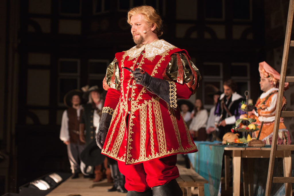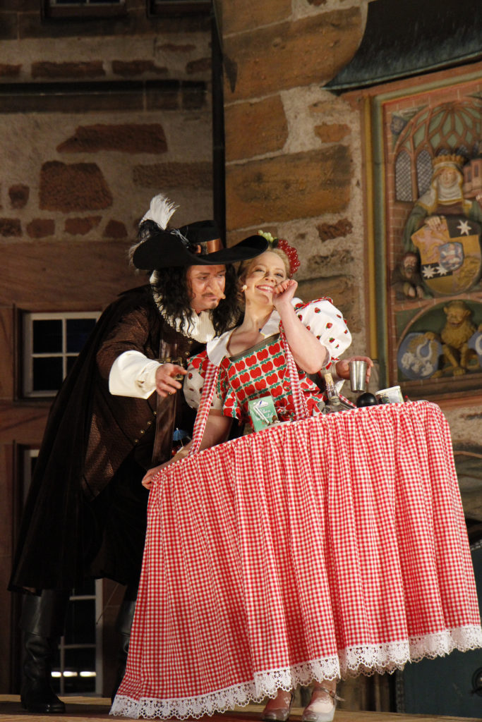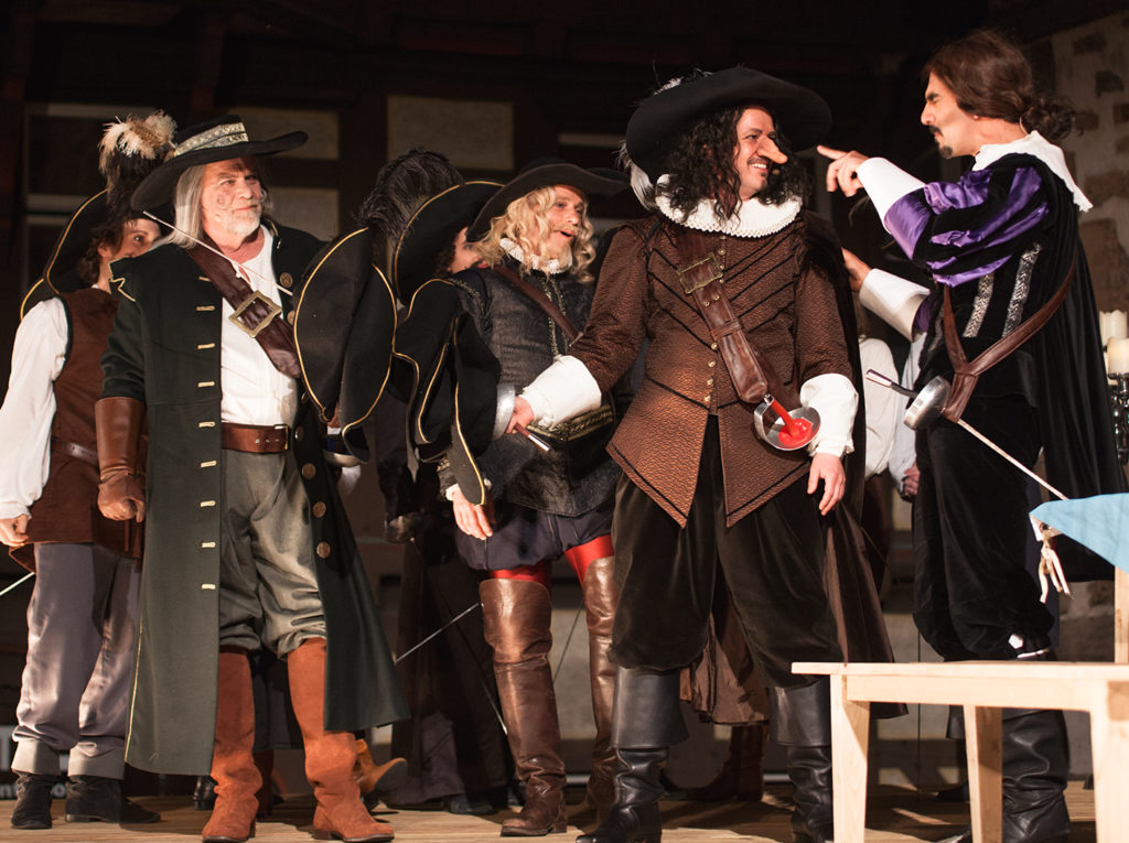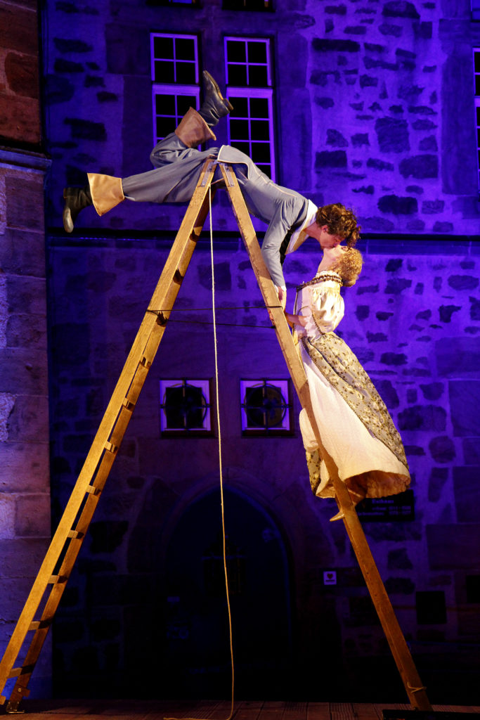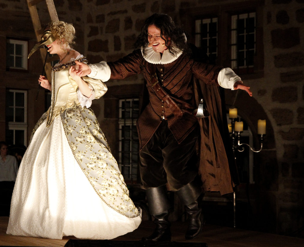Angemessen wirkte der konsequenter Einsatz historischer, teils sehr prächtiger und auch komischer Kostüme vor der Kulisse des historischen Rathauses, das in Spiel eingebunden wurde. (...) Aber einige kleine ironische Brechungen der Theater Illusion von der Zeit Ludwigs XIII. hat man sich erlaubt (...) Gelangweilt setzte sich beispielsweise die Begleiterin Roxanes die heute allgegenwärtigen übergroßen Kopfhörer auf, nur dass diese zu Schnecken gedrehte Zöpfe aussahen.