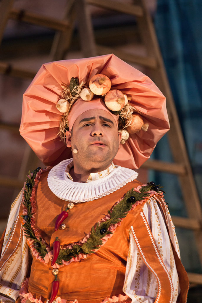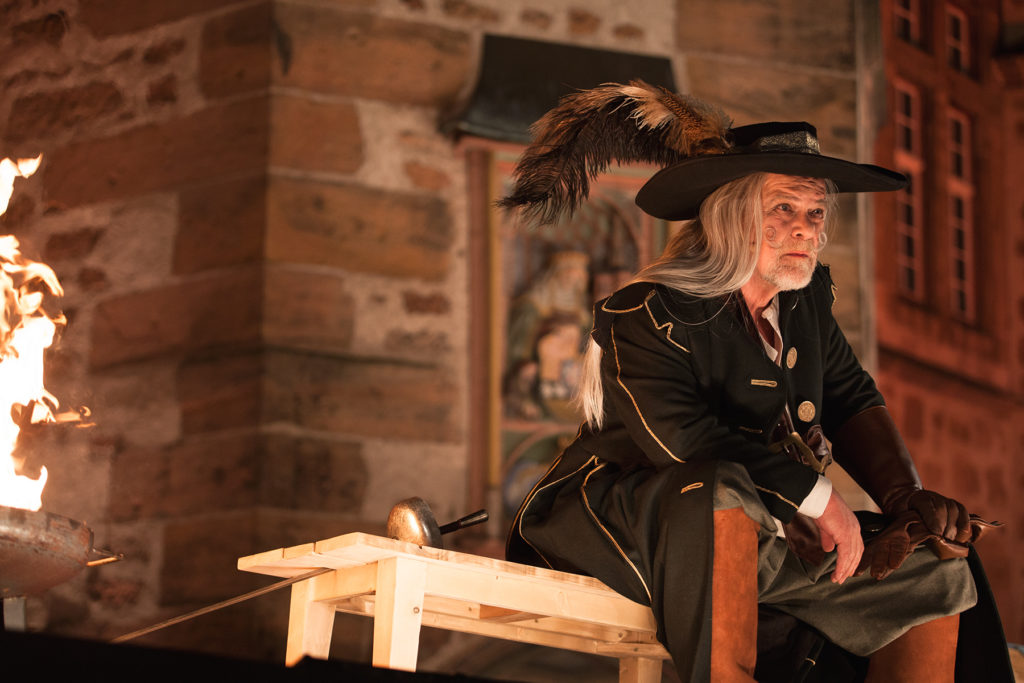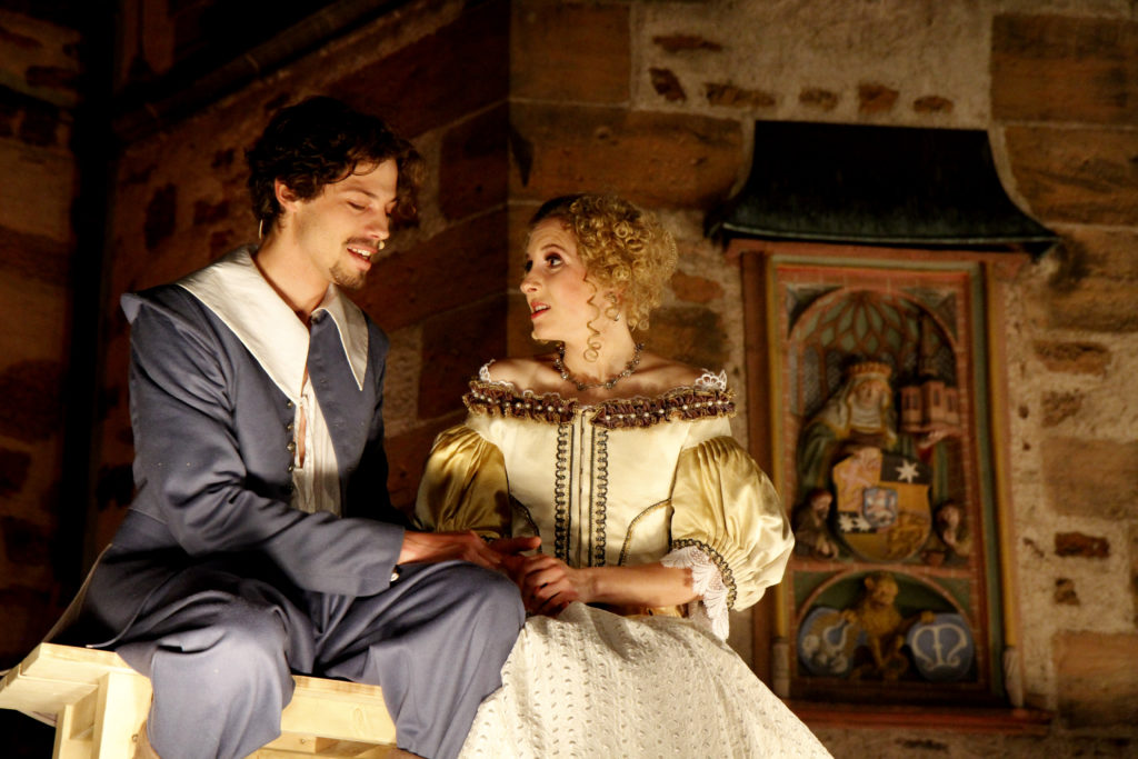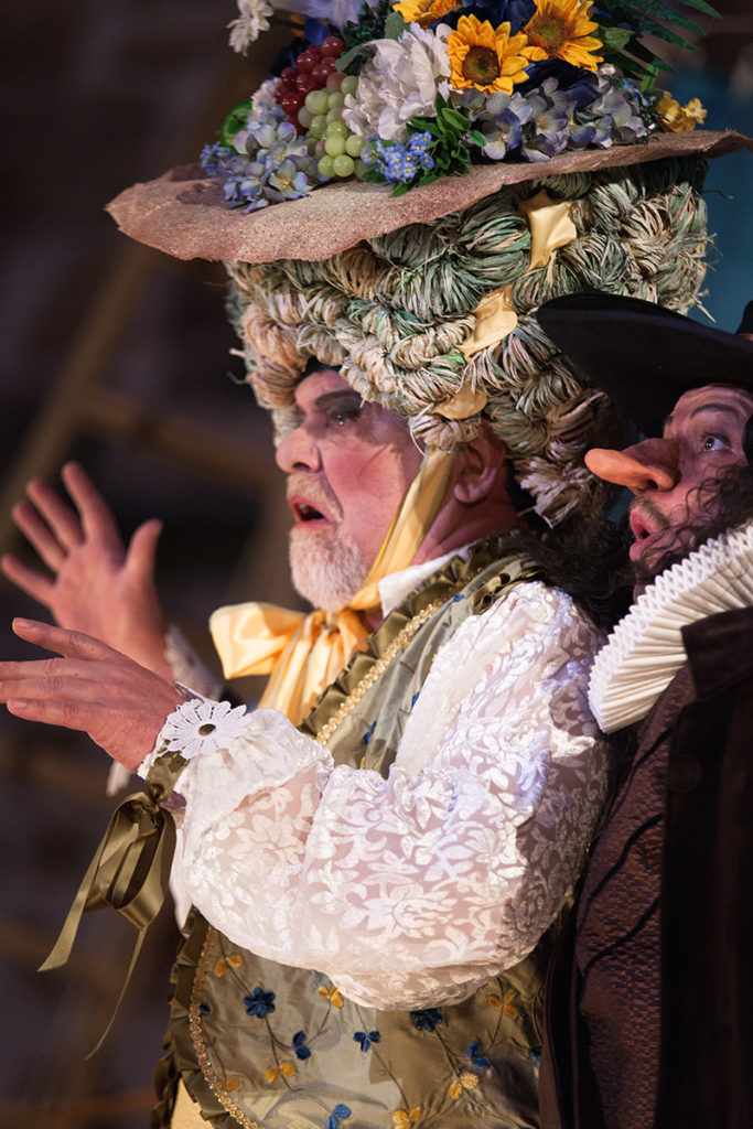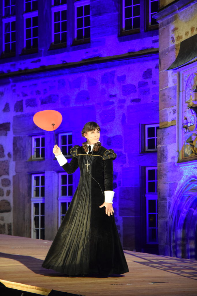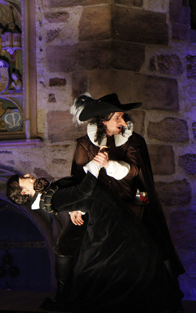 Angemessen wirkte der konsequenter Einsatz historischer, teils sehr prächtiger und auch komischer Kostüme vor der Kulisse des historischen Rathauses, das in Spiel eingebunden wurde. (...) Aber einige kleine ironische Brechungen der Theater Illusion von der Zeit Ludwigs XIII. hat man sich erlaubt (...) Gelangweilt setzte sich beispielsweise die Begleiterin Roxanes die heute allgegenwärtigen übergroßen Kopfhörer auf, nur dass diese zu Schnecken gedrehte Zöpfe aussahen.